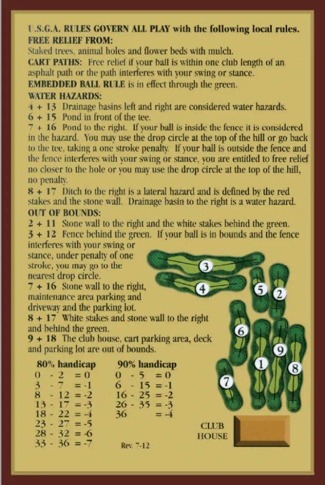 The course is a 9-hole layout, with 4 sets of tees ranging from 2548 yards to 3187 yards. With four sets of tees, we can accommodate all levels of play for nine or eighteen holes. Our pace of play guideline is nine holes in two hours.